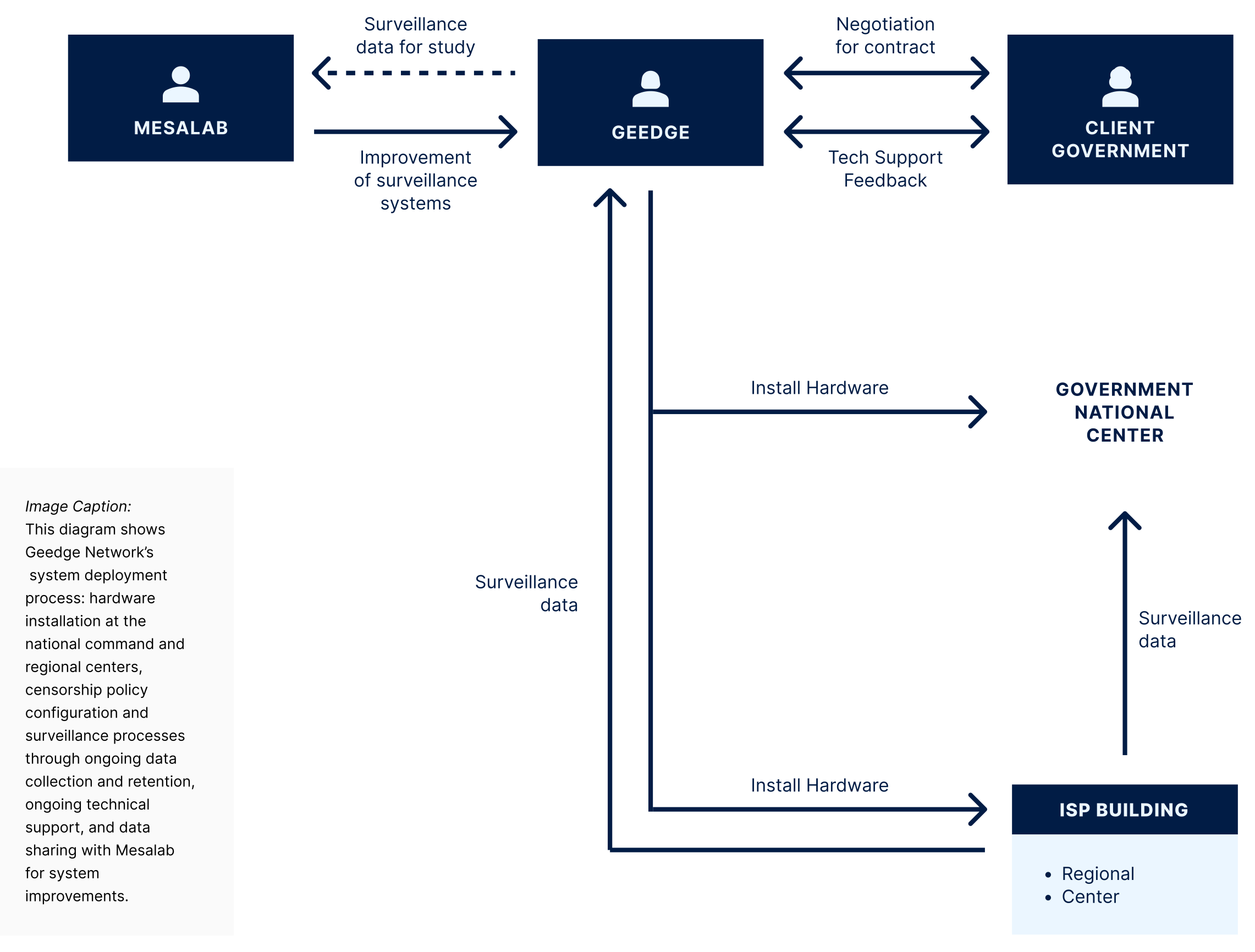 圖片說明:此圖示展示 Geedge Networks 的系統部署過程:在國家指揮和地區中心安裝硬體、通過持續的數據收集和保存進行審查政策配置和監控流程、持續的技術支持,以及與 Mesalab 共享數據以改善系統。