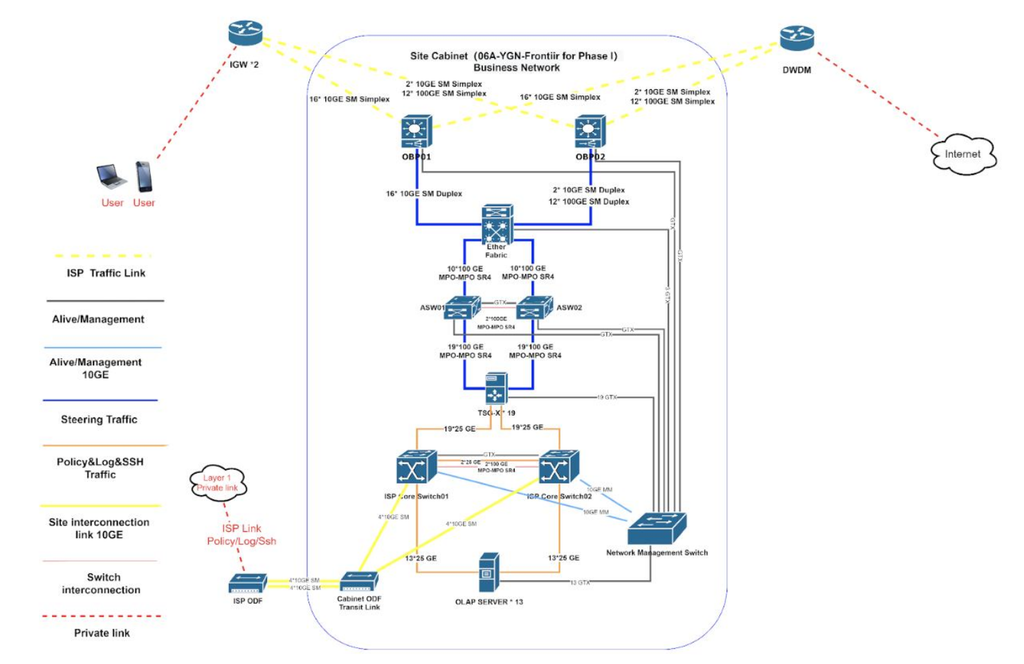 圖片說明:從 Geedge Networks 資料數據中提取的圖像顯示了 Frontiir 仰光數據中心的網路拓撲,其中 Geedge 的硬體整合到了 ISP 的網路基礎設施中。